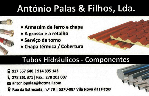 António dos Santos PalasEmpresa sediada em Mirandela, com um trabalhador ao seu serviço com mais de 25 anos de experiência, para prestar serviços em todo o campo de serralharia mecânica, ferro, chapa, inox, tornearia mecânica e tubos hidráulicos, entre outros. Reparações de maquinas agricolas, tubos hidraulicos, venda de ferro e chapa a grosso e a retalho.Comercializamos o seguinte material:Cubas Inox